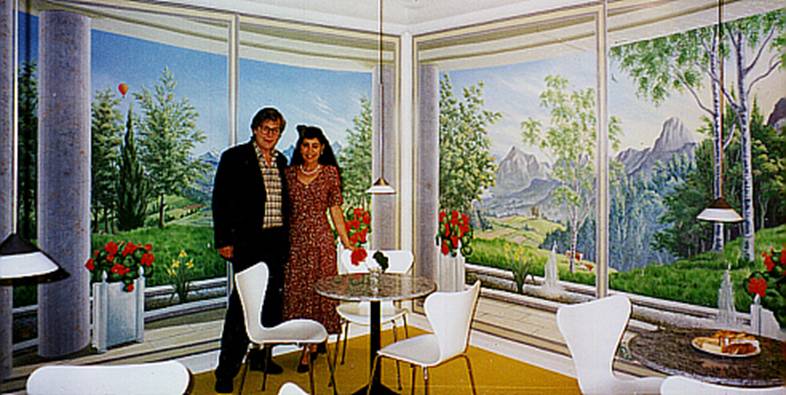 Panoramic landscape of the Bernese Alps with terrace and fountains, painted in an underground restaurant near Interlaken, Switzerland. 10x2.5m at a country house near Maidstone, UK. 12x2.5m.